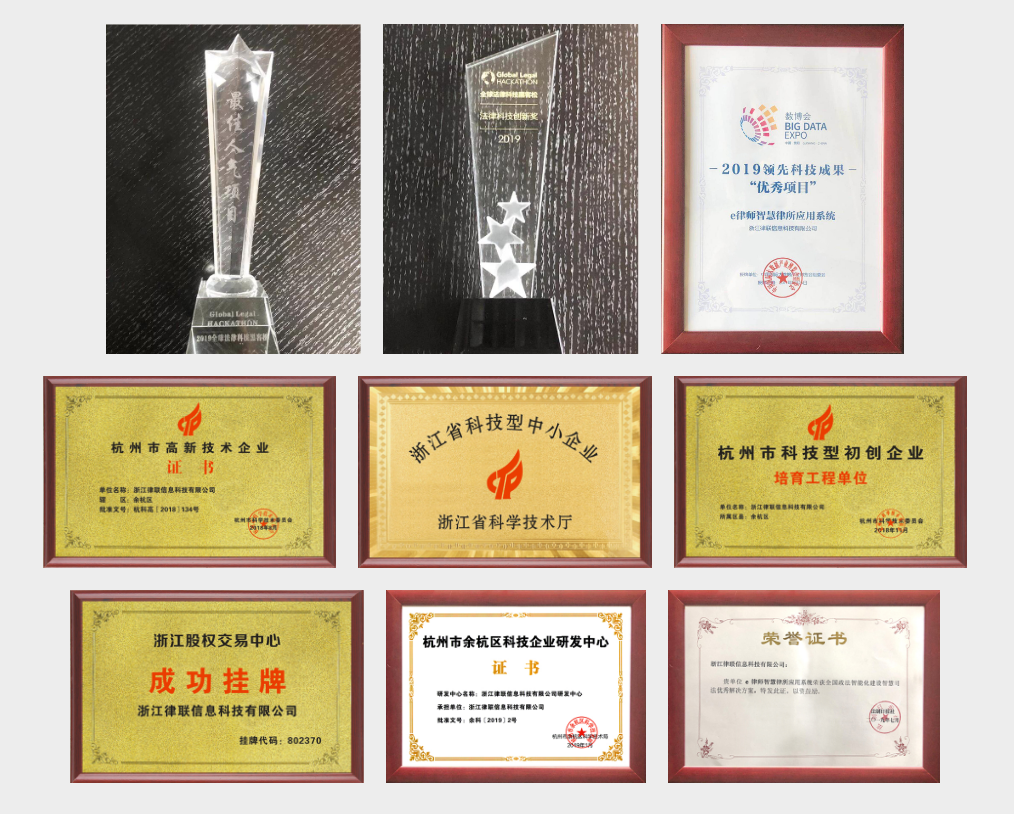 榮獲GLH2019第二屆全球法律科技黑客松大賽武漢賽區(qū)“法律科技創(chuàng)新獎(jiǎng)”和“最佳人氣項(xiàng)目獎(jiǎng)”;榮獲2019中國(guó)國(guó)際大數(shù)據(jù)博覽會(huì)“優(yōu)秀項(xiàng)目”獎(jiǎng)項(xiàng);榮獲2019全國(guó)政法智能化建設(shè)智慧司法優(yōu)秀解決方案獎(jiǎng);軟件著作權(quán)共19項(xiàng)。